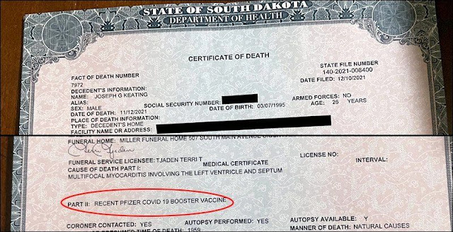 Ένα πιστοποιητικό θανάτου που εκδόθηκε από την Πολιτεία της Νότιας Ντακότα και ελήφθη από τον Defender αναφέρει την αιτία θανάτου του Keating από «πολυεστιακή μυοκαρδίτιδα που αφορά την αριστερή κοιλία και το διάφραγμα», με μια δεύτερη αιτία θανάτου να αναφέρεται ως «πρόσφατο ενισχυτικό εμβόλιο Pfizer Covid-19».